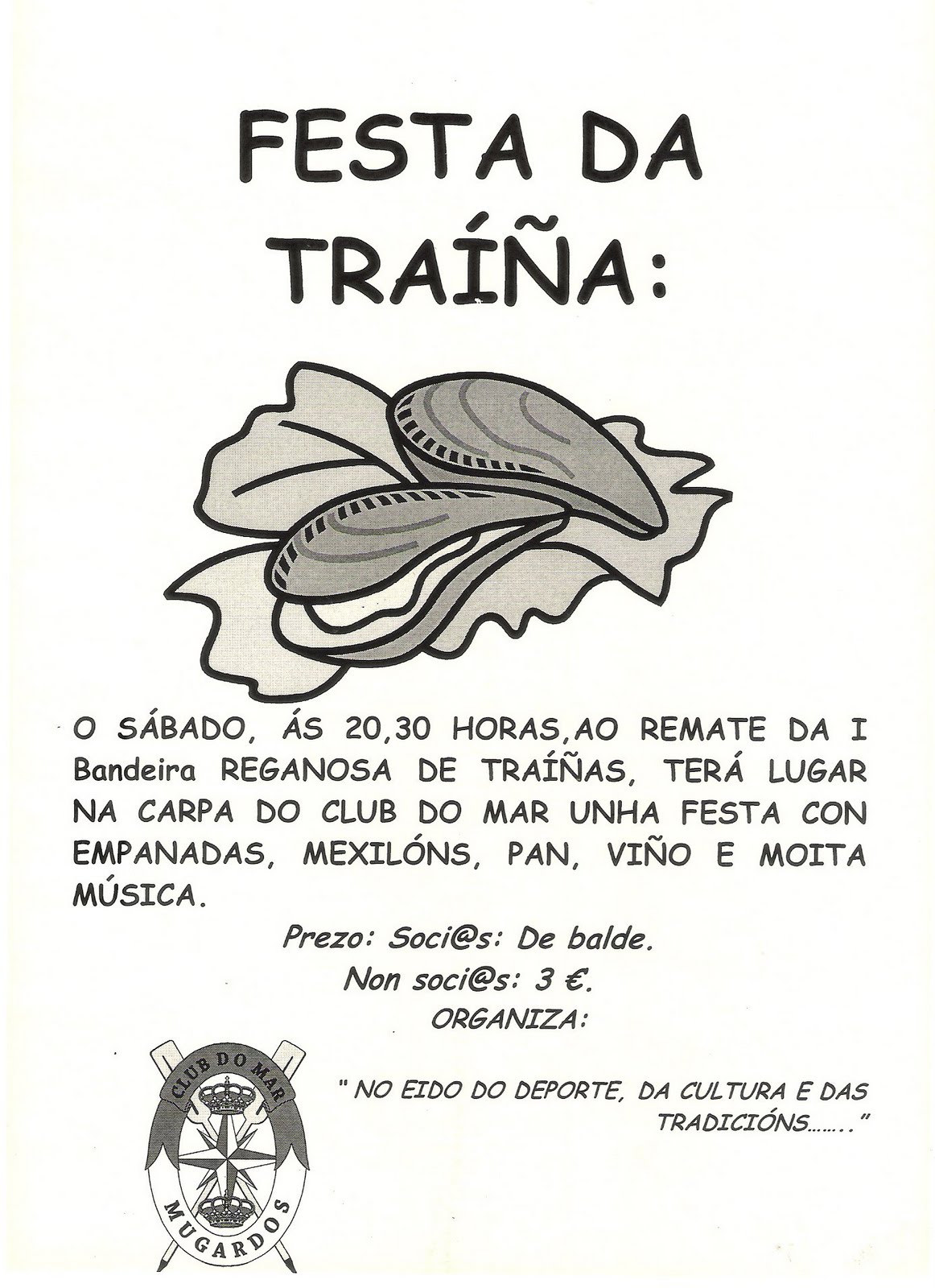 Despois da regata as 20.30 comezará na carpa situada diante do Club do Mar a “Festa da Traíña”, na que se poderá disfrutar de mexillóns, empanada, viño e moita música. A consumición será de balde para os socios e a 3€ para o resto da xente.